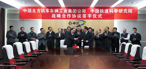 我院与中国北方机车车辆工业集团公司(以下简称“中国北车”)均是中国铁路产业高科技发展的领跑者和重要骨干型企业,有着悠久的合作历史。双方优势互补性强,具有良好的合作基础。为进一步深化和拓展我院与中国北车的战略合作,发挥铁科院和中国北车在科技研发、标准建立、咨询服务、产品认证、科技成果转化、产业链建设等方面的比较优势,提升双方市场竞争能力,满足国际国内轨道交通快速发展需求和非轨道产业的市场需求,双方经友好协商,按照“优势互补、互利共赢、积极推进、共同发展”的原则,达成战略合作框架协议。